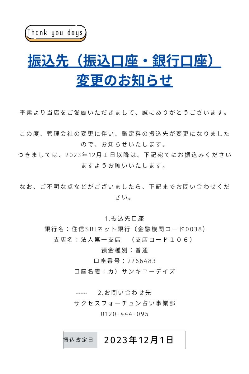 振込先(振込口座・銀行口座)変更のお知らせ2023.11.30